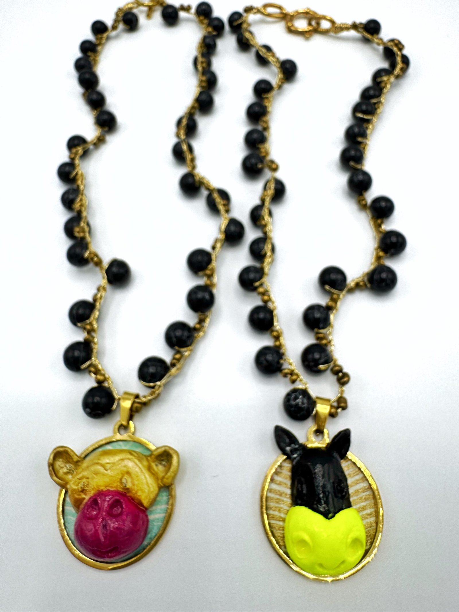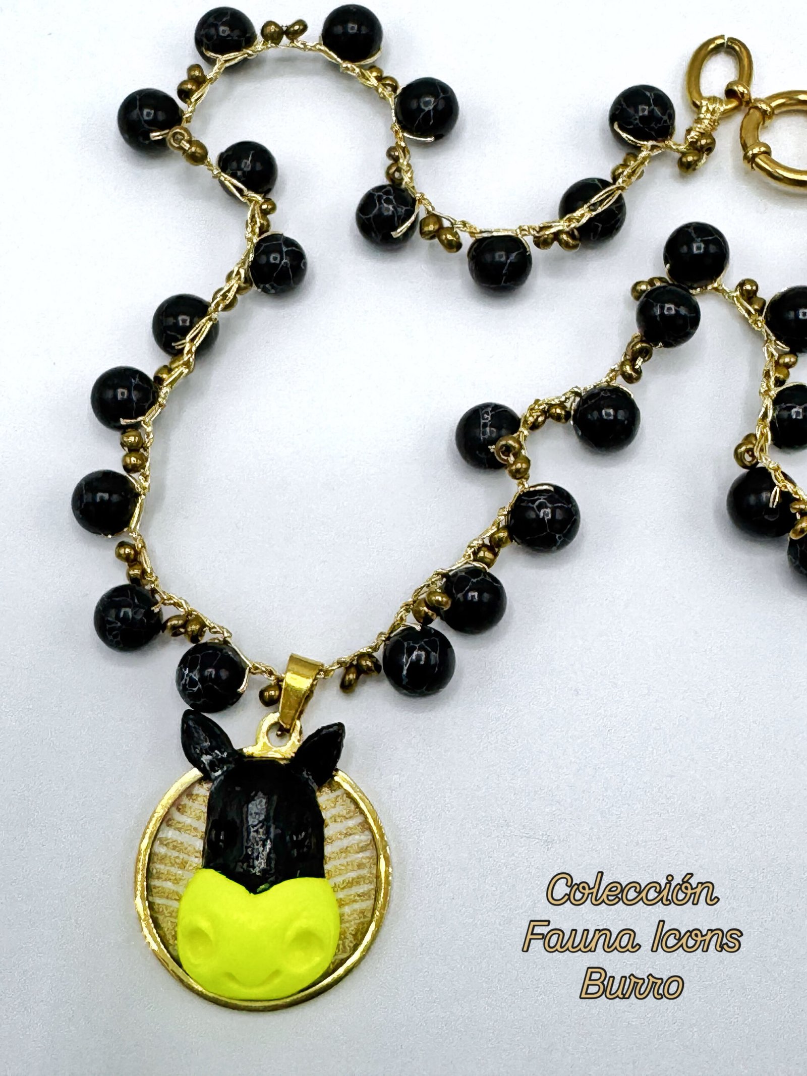 Entre mini collar y Gargantilla Vilali tejida a mano con hilos dorados engarzados con cuentas de piedra color ceniza o mezcladas con mini cuentas de cristal reciclado africano en color oro viejo con colgante en forma de camafeo con cabujón de acero decorado con figura de cabeza de burro en relieve realizada a mano con porcelana fría con cierre de acero dorado con grillete. Color negro y dorado con acabado dorado