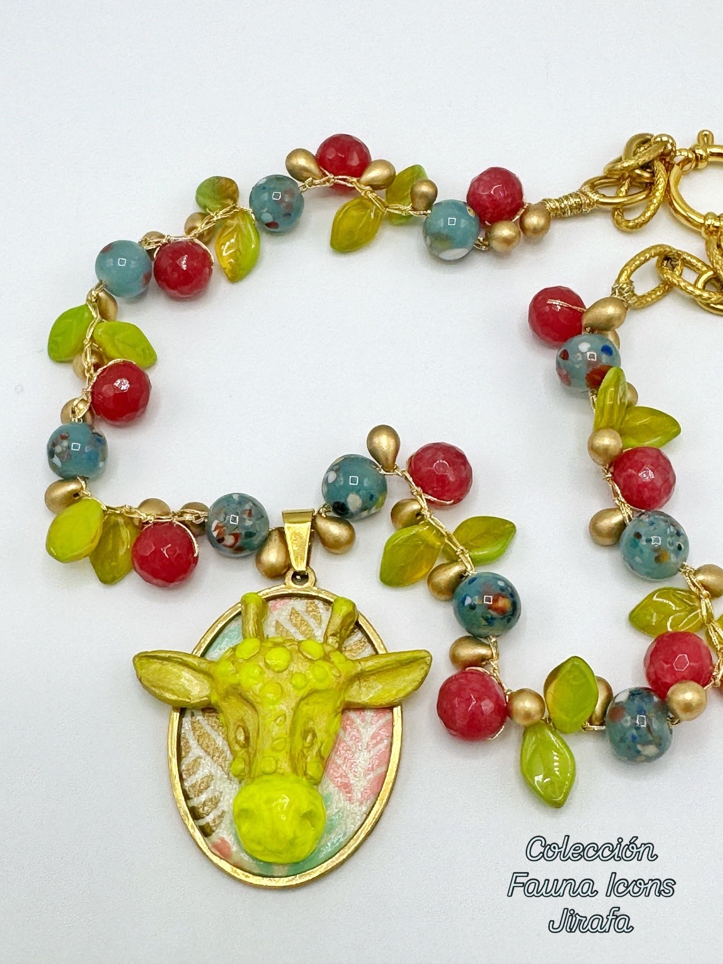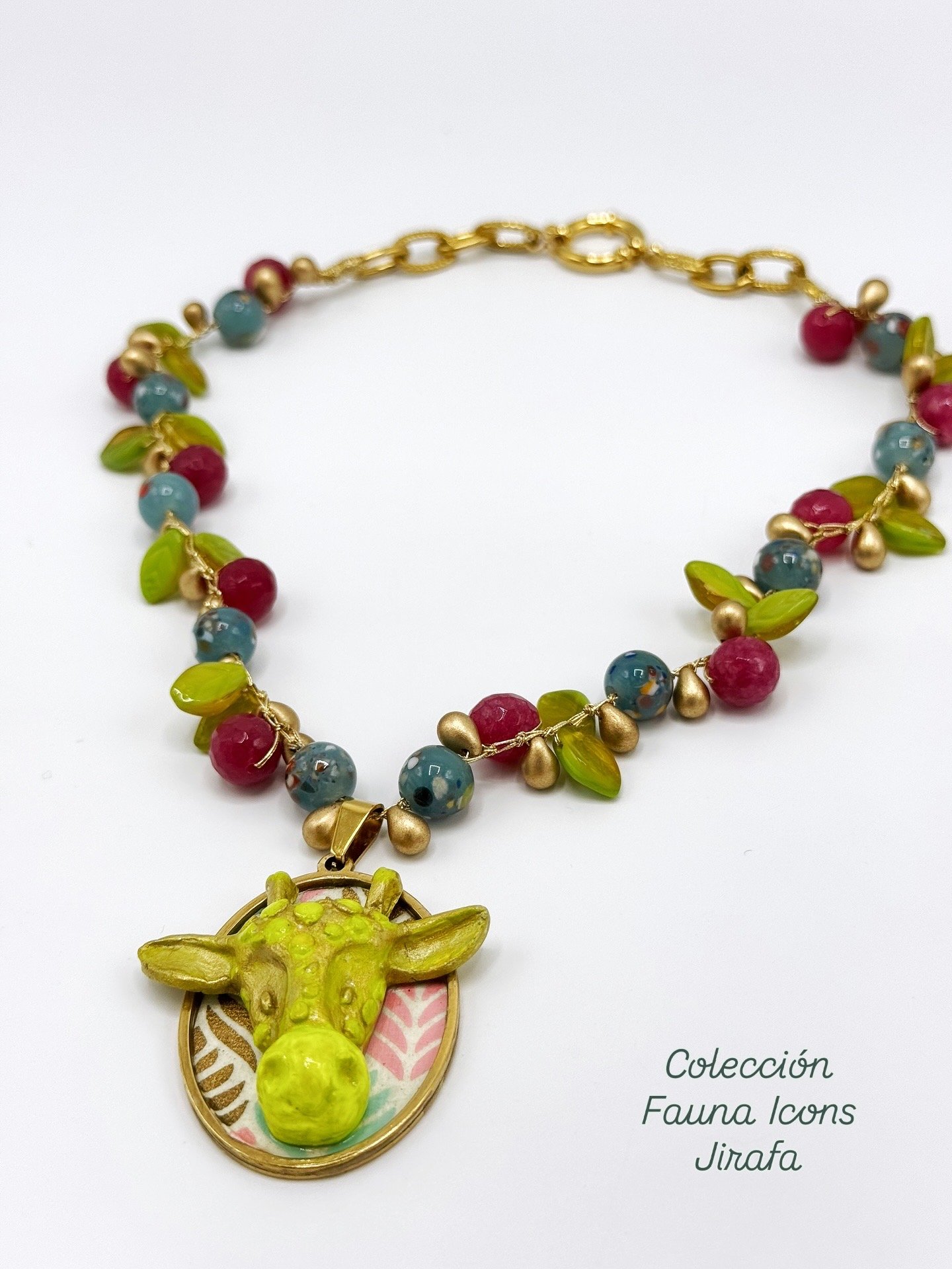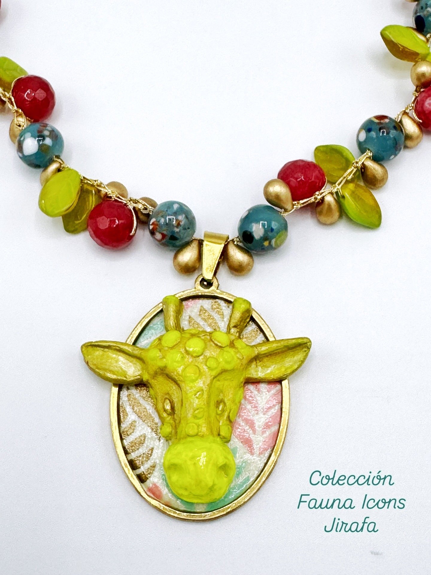 Gargantilla Vilali tejida a mano con hilo dorado engarzado con maxi cuentas de cristal reciclado africano en color azul bebé con pequeñas pintitas de colores mezclado con cuentas en forma de hoja de cristal checo de color lima, cuentas en forma de gota dorada también de cristal Checo y cuentas de ágata rosa con colgante en forma de camafeo con cabujón de acero decorado con figura de cabeza de jirafa en relieve realizada a mano con porcelana fría con cierre de acero dorado con grillete. Color azul, rosa y verde lima con acabado dorado