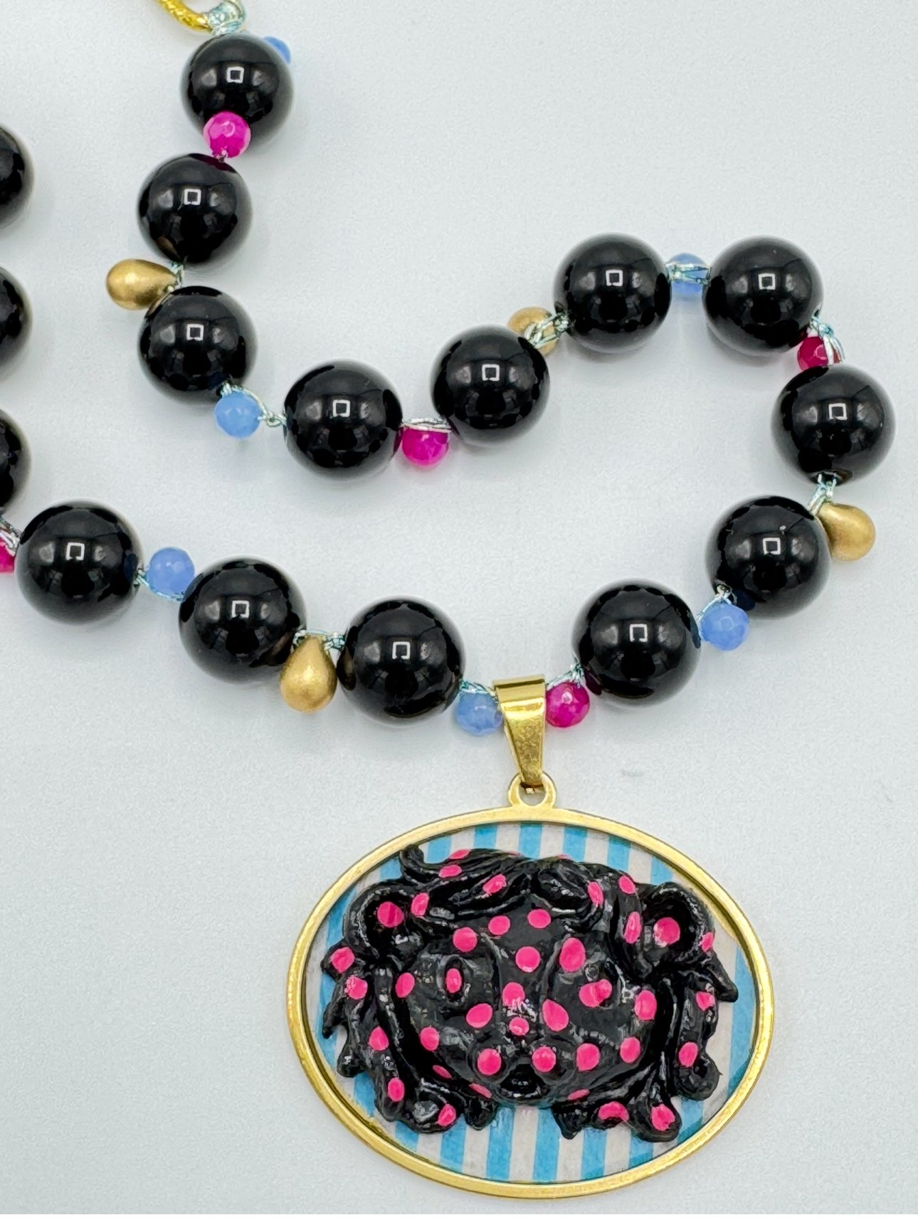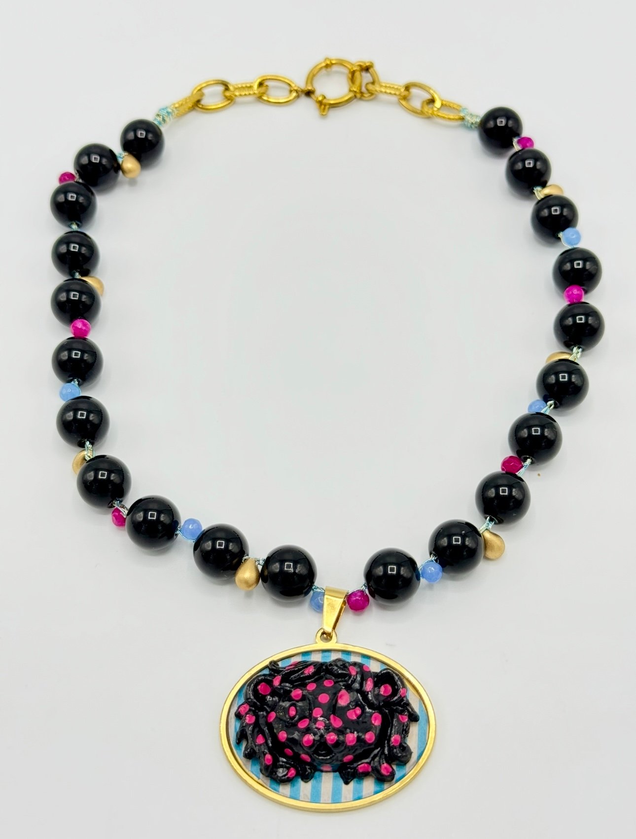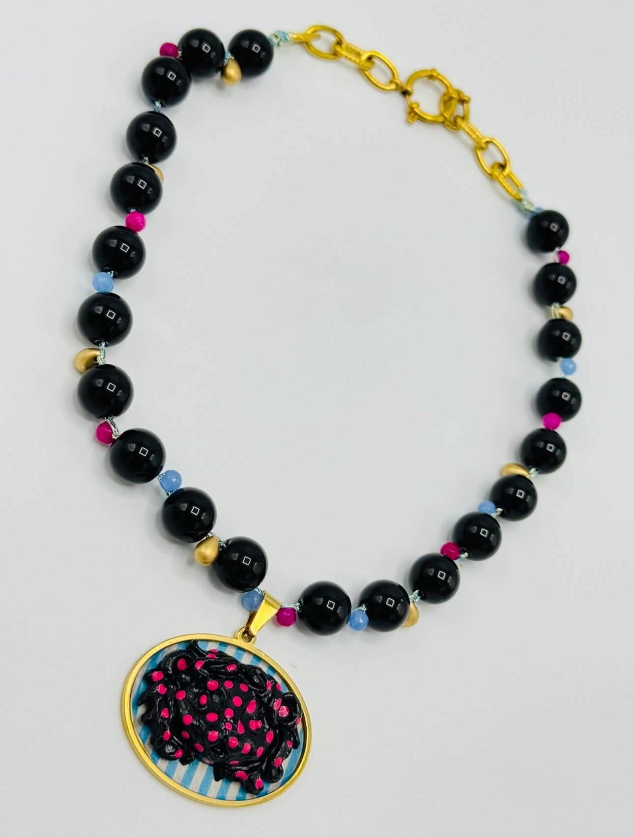 Gargantilla Vilali tejida a mano con hilos dorados engarzados con maxi cuentas de ágata en color negro mezcladas con mini cuentas de ágata en color fucsia y azules con cuentas en forma de gota dorada de cristal Checo con colgante en forma de camafeo con cabujón de acero decorado con figura de cabeza de león en relieve realizada a mano con porcelana fría con cierre de acero dorado con grillete. Color negro, azul, fucsia y dorado con acabado dorado