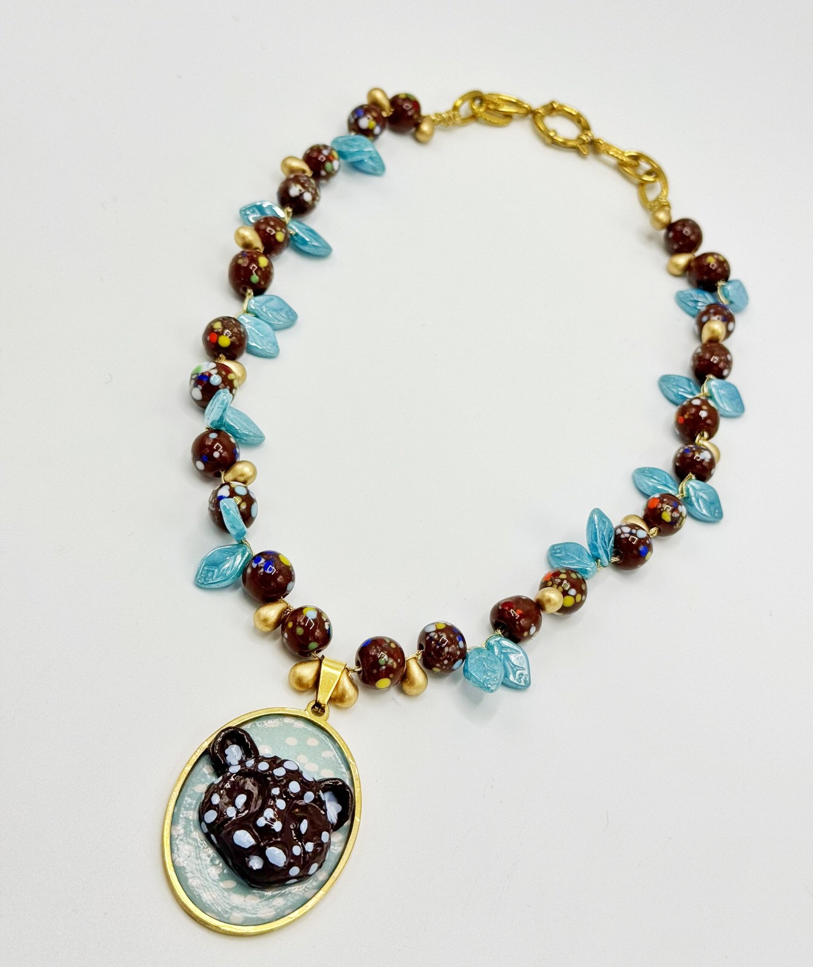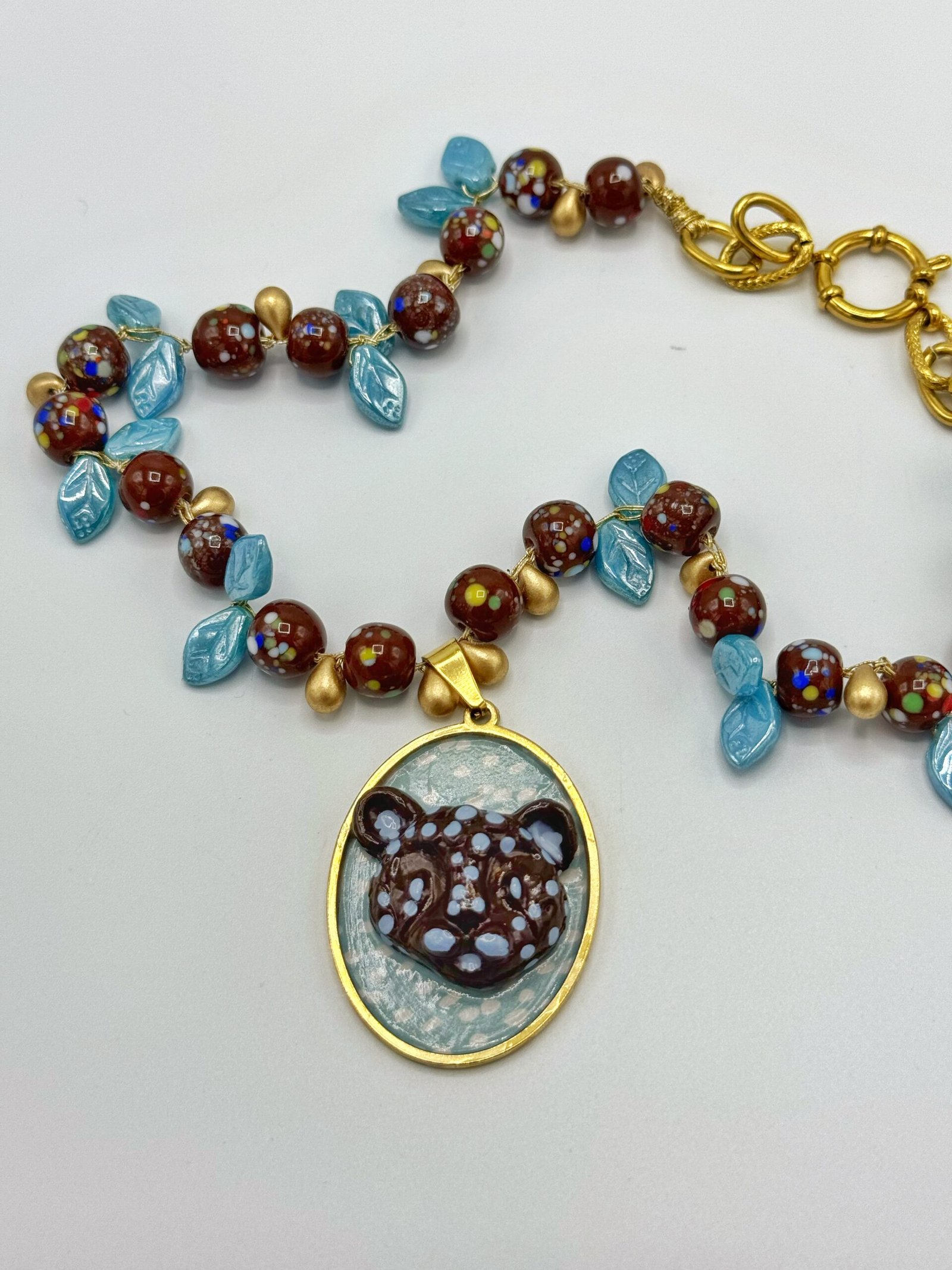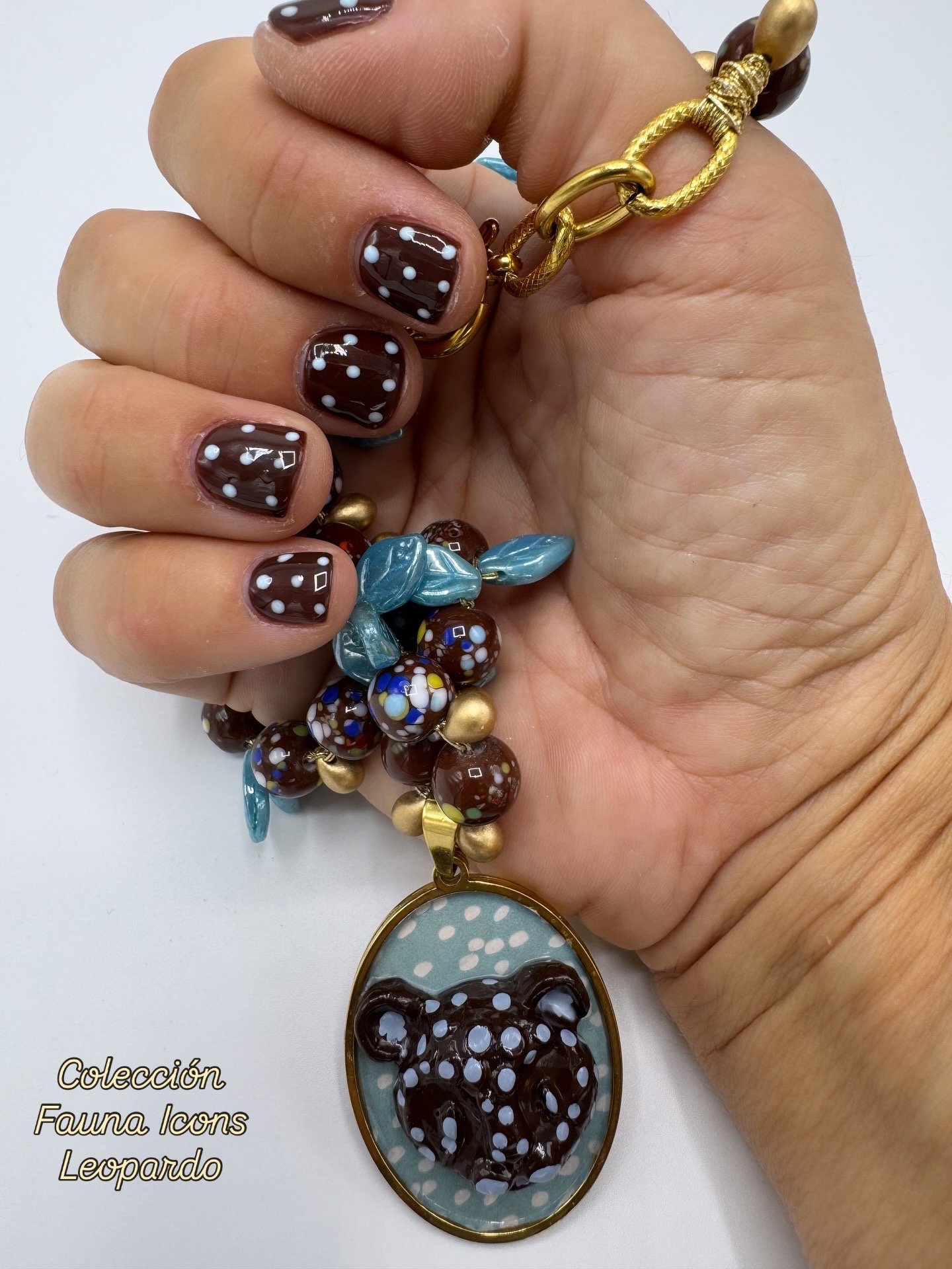 Gargantilla Vilali tejida a mano con hilos dorados engarzados con maxi cuentas de cristal reciclado africano en color chocolate con pequeñas pintitas de colores mezclado con cuentas en forma de hoja de cristal checo de color azul y cuentas en forma de gota dorada también de cristal Checo con colgante en forma de camafeo con cabujón de acero decorado con figura de cabeza de leopardo en relieve realizada a mano con porcelana fría con cierre de acero dorado con grillete. Color azul, chocolate y dorado con acabado dorado
